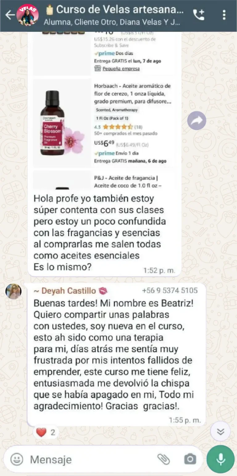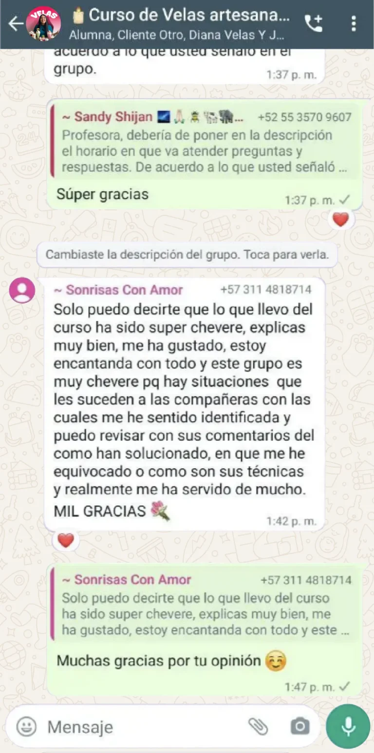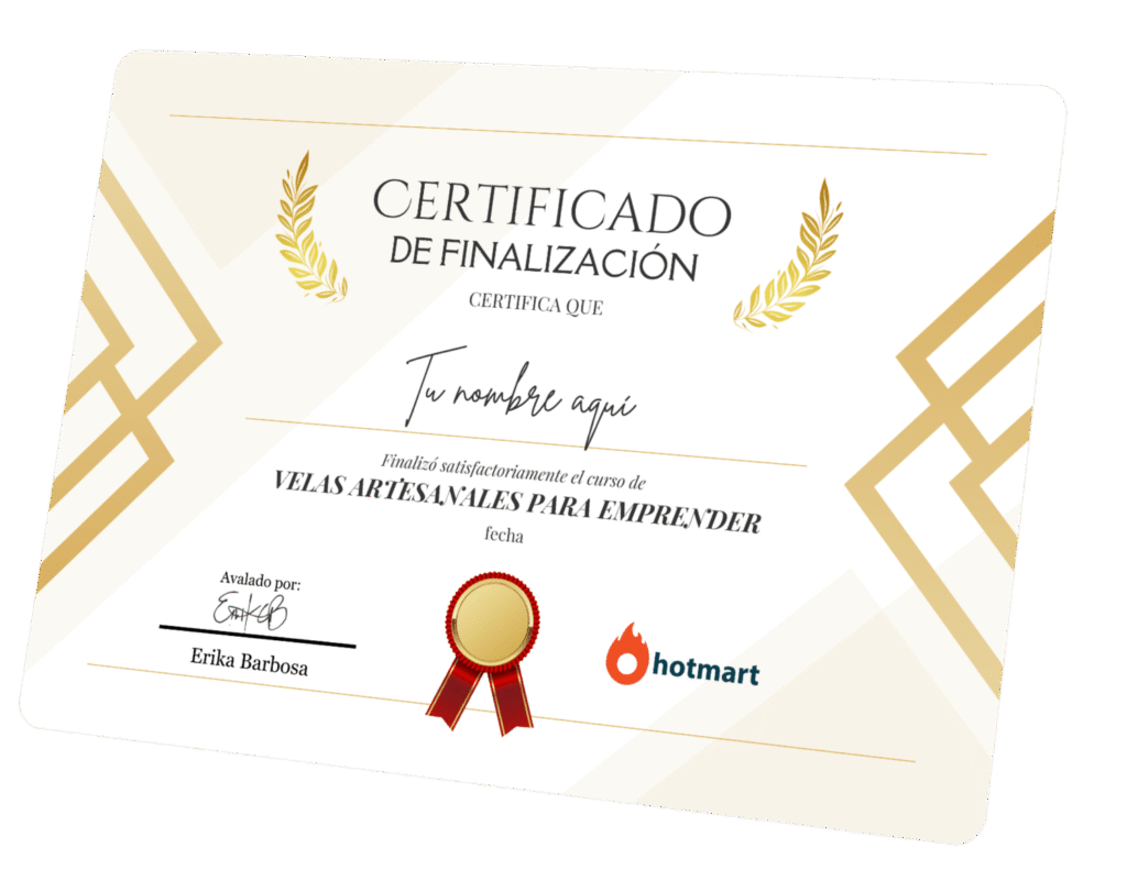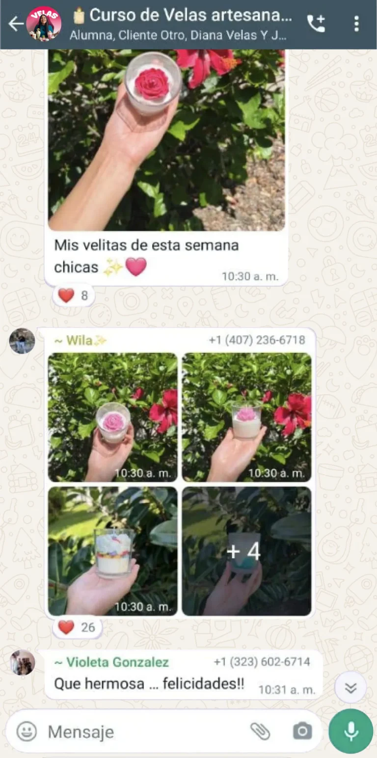 El curso es hermoso y las clases son muy claras. La plataforma me funcionó perfecto y aprendí a hacer mis velas rápidamente porque la profesora explica con muchísima paciencia. Gracias a Dios ya tengo mis primeros pedidos y poco a poco mi emprendimiento va creciendo. Sin duda, este curso está hecho con mucho amor.
