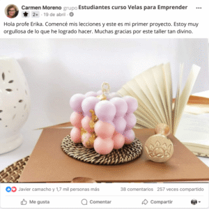 Llevo años dedicándome a la elaboración de velas, pero siempre estoy en busca de nuevas técnicas y tendencias. Había buscado cursos que enseñaran a trabajar con cera de soya y velas modernas, pero no encontraba lo que necesitaba. Hasta que vi la publicidad de la profe Erika, hice la compra… ¡y fue justo lo que estaba buscando! Estoy encantada con este curso.